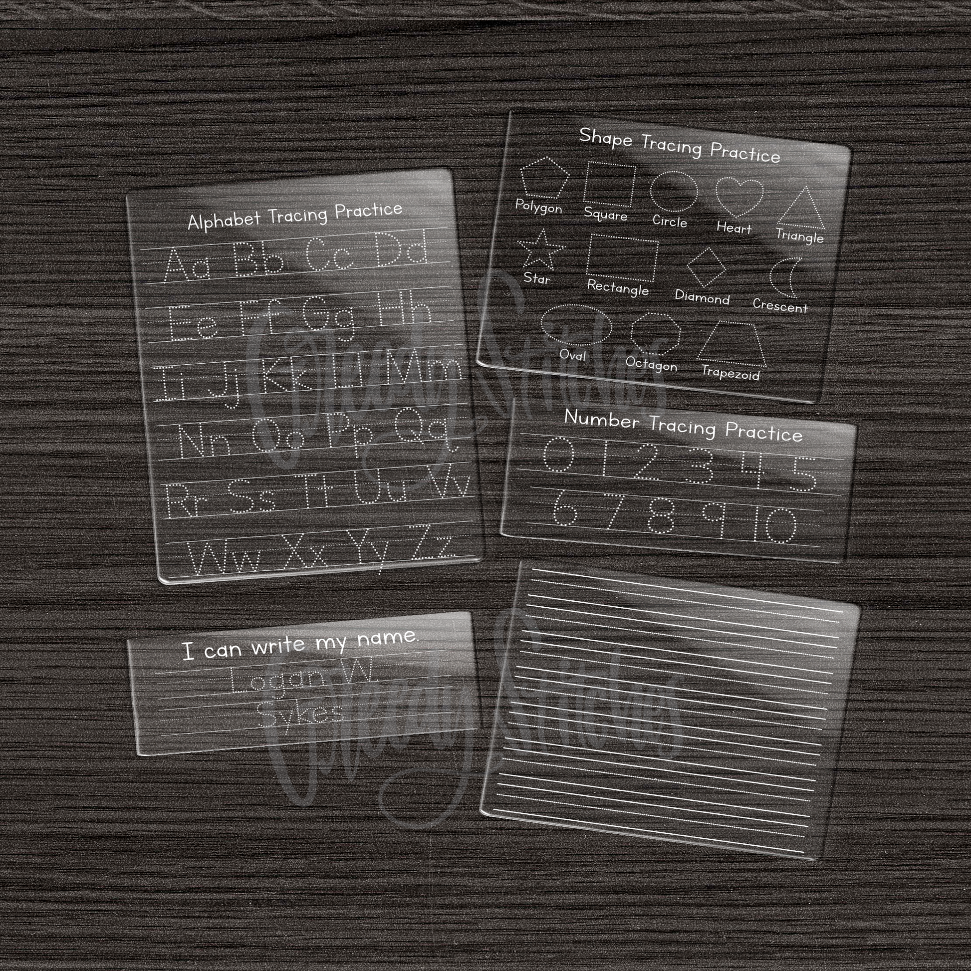 Watch as your children practice their skills with these reusable tracing boards! Our boards are designed to support early educational development & are perfect for children learning to write, count, & recognize shapes. Each board is made from 1/4” durable acrylic with rounded edges for the littles. Can be wiped clean after use with dry erase markers. They may be purchased as a bundle or individually.