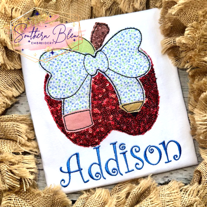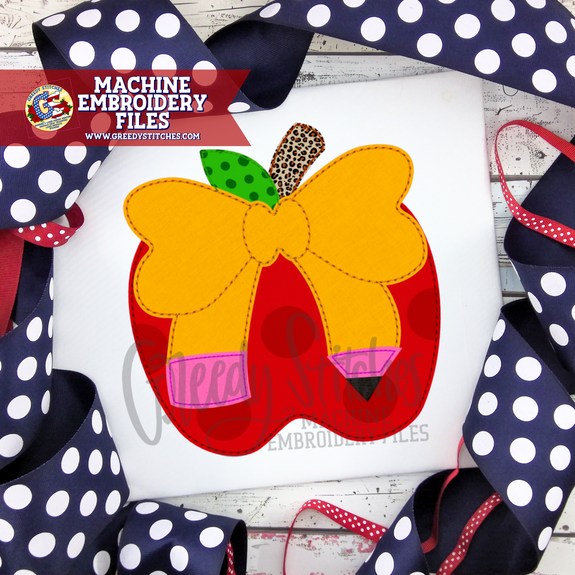 Apple with Pencil Bow Applique Machine Embroidery Design