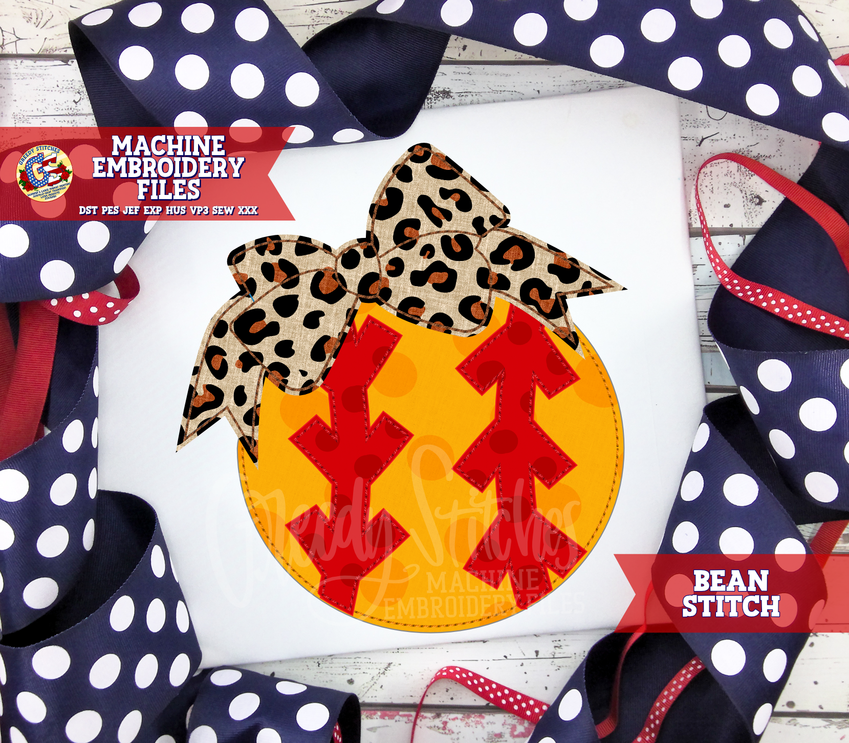 Baseball Softball with Bow Applique Machine Embroidery Design - Bean Stitch Applique