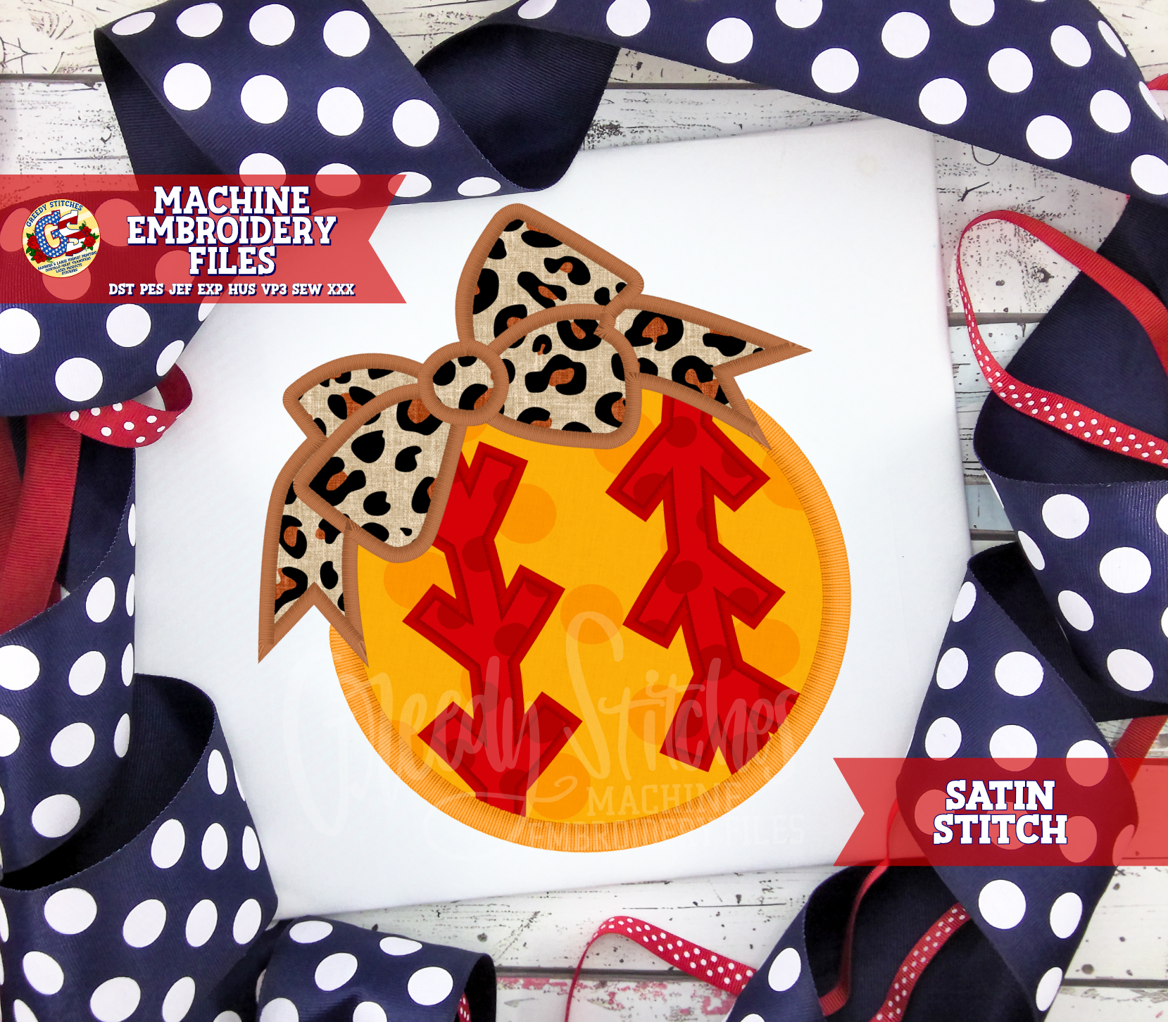 Baseball Softball with Bow Applique Machine Embroidery Design - Satin Stitch Applique