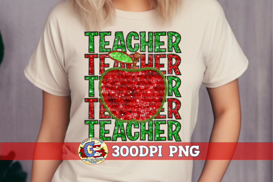 Faux Embroidered Sequin Teacher and Apple PNG for Sublimation