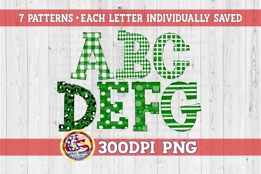 All uppercase alphas with 7 pattern fills in individually saved files. There will not be a need to separate letters as they're each in a file of their own.