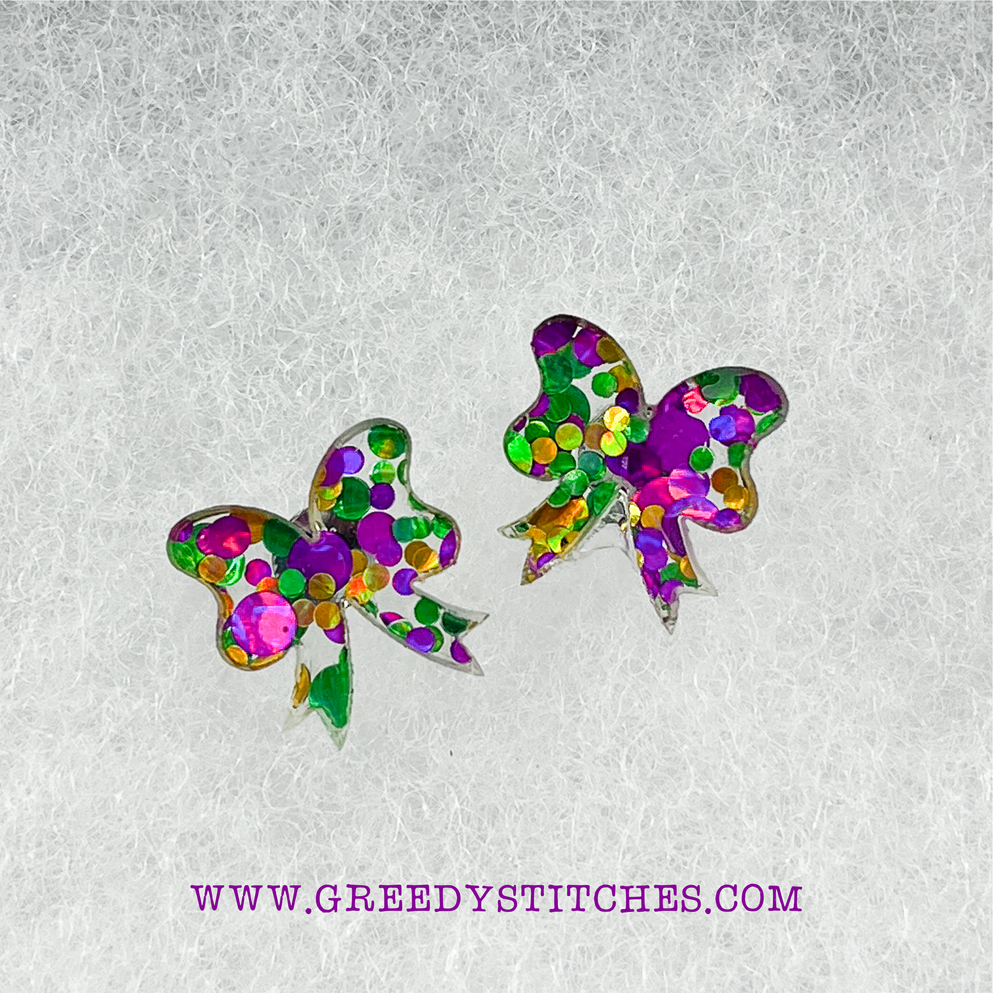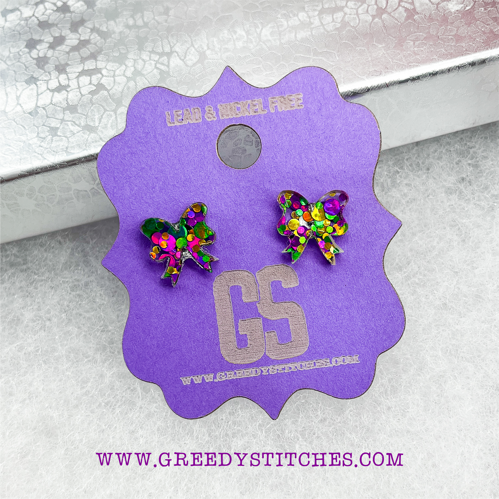 These earrings are made from a Mardi Gras glitter acrylic. They're laser cut into a bow shape. Each stud is 0.5" wide and are nickel and lead free.