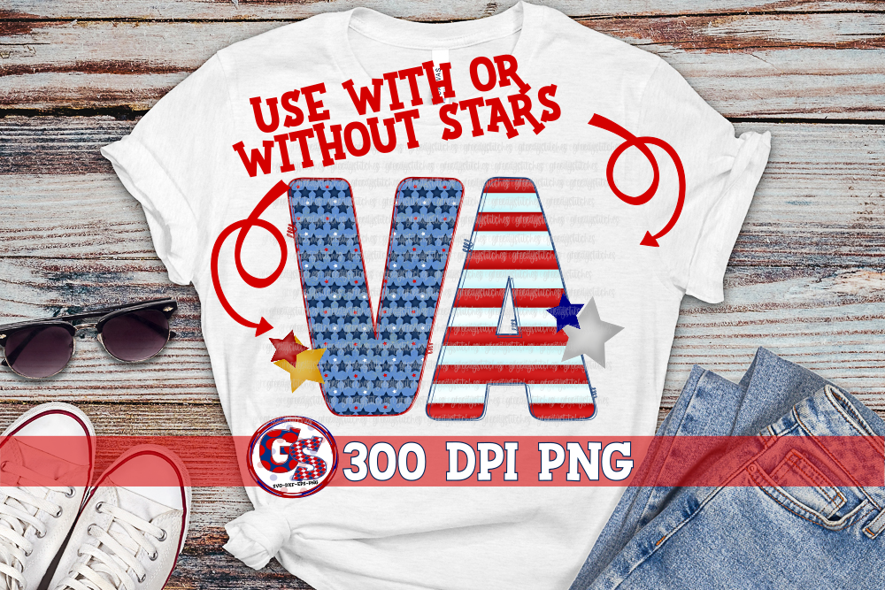 1 state abbreviation & 4 individual stars with transparent backgrounds, saved at a minimum of 3600 px wide. The files can be used with or without stars.