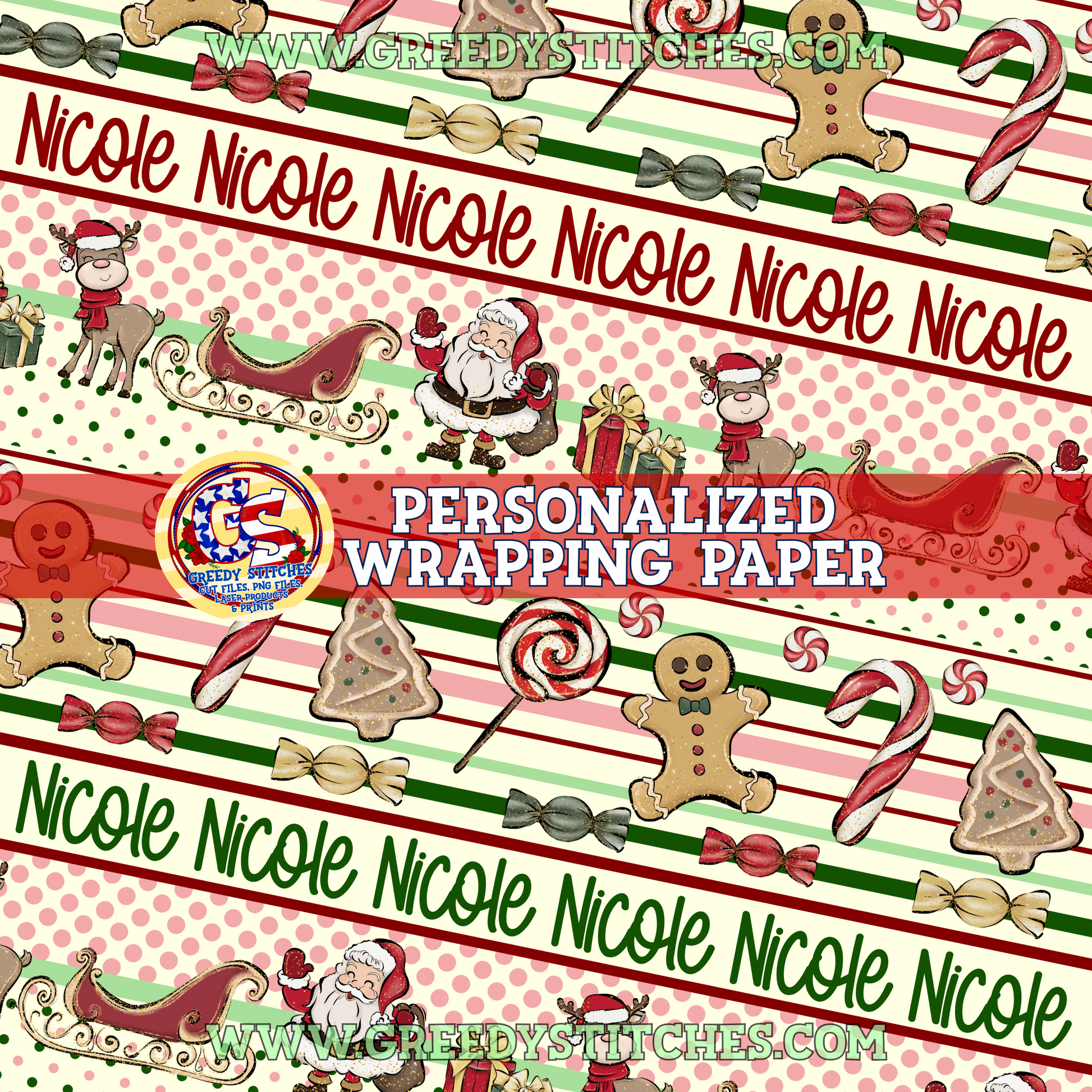 30" Pink & Green Santa Reindeer Candy Personalized Wrapping Paper