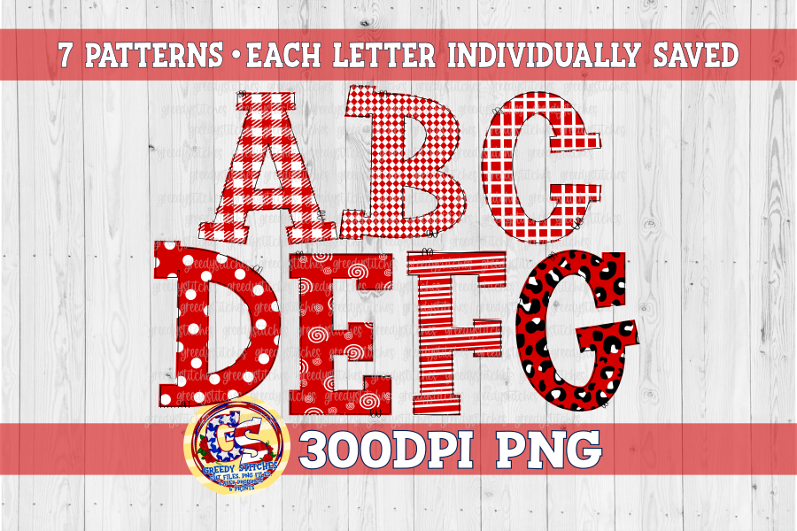 All uppercase alphas with 7 pattern fills in individually saved files. There will not be a need to separate letters as they're each in a file of their own.