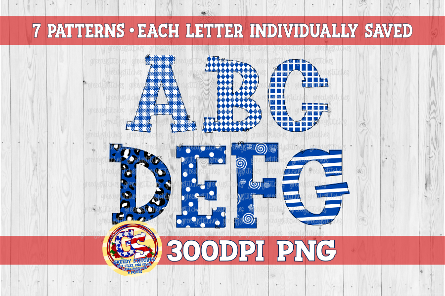 All uppercase alphas with 7 pattern fills in individually saved files. There will not be a need to separate letters as they're each in a file of their own.
