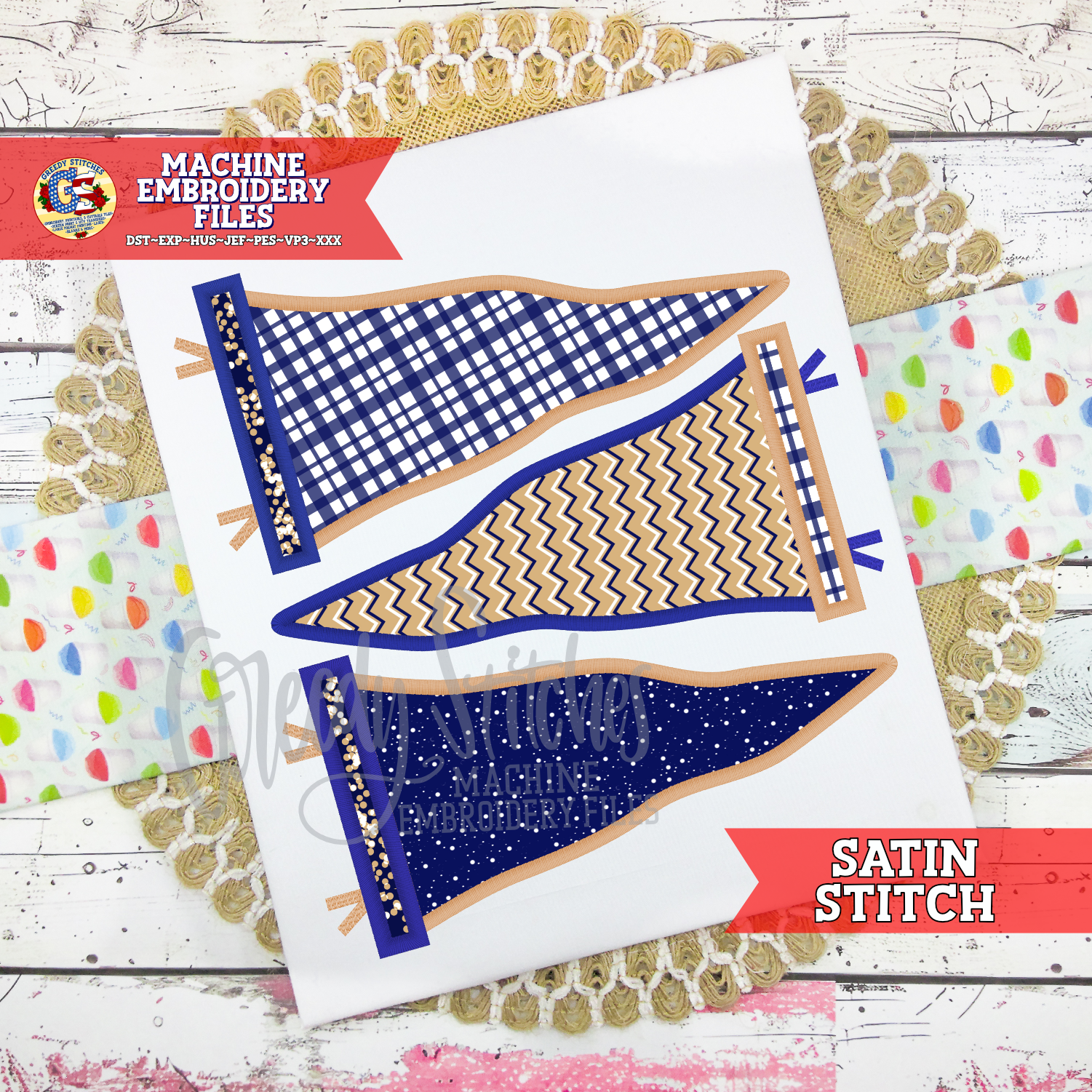 Triple Pennants Satin Applique Machine Embroidery Design